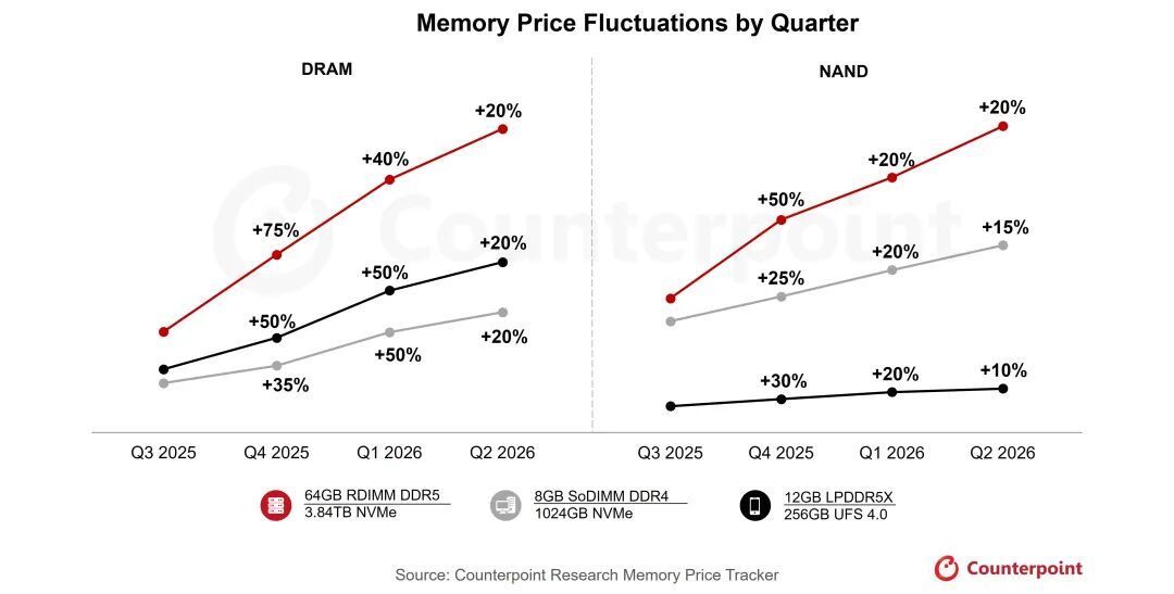 然而,这种涨价行情还没有到终点。调研机构Counterpoint Research指出,存储芯片市场已进入“超级牛市”阶段,当前行情甚至超越了2018年的历史高点。预计2026年一季度存储芯片价格将飙升40%~50%,二季度预计还将再上涨约20%。